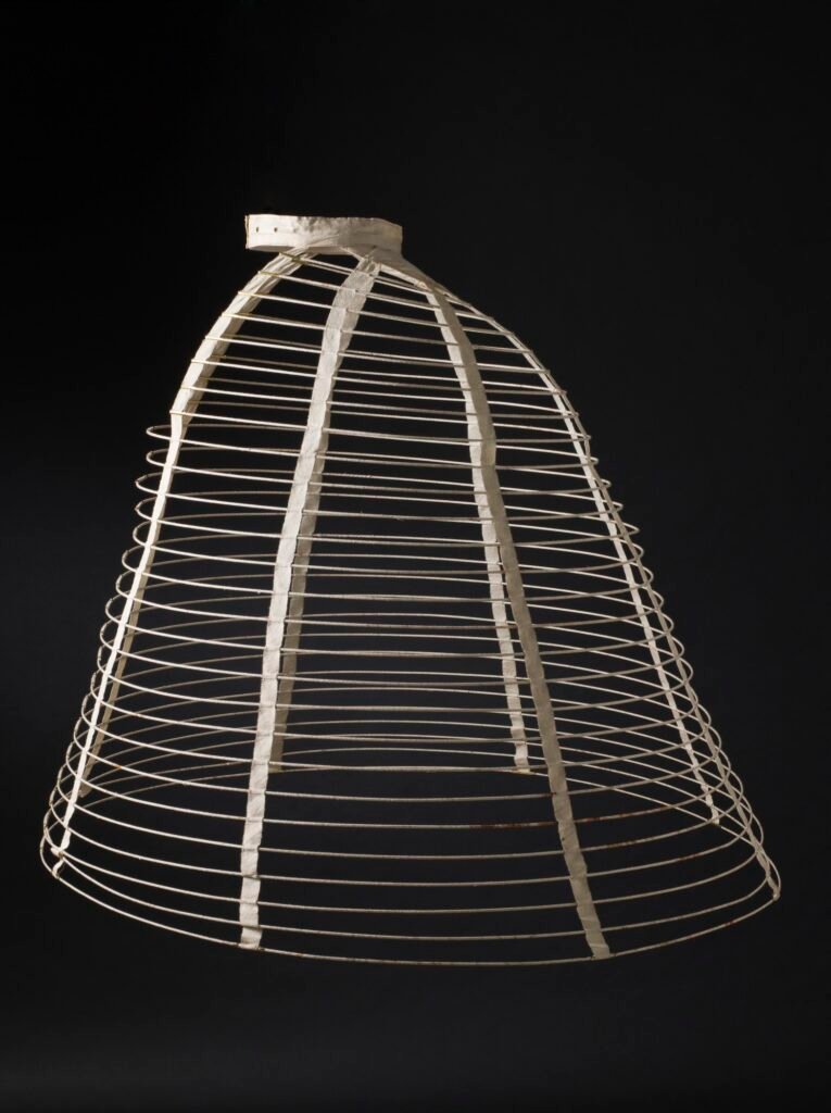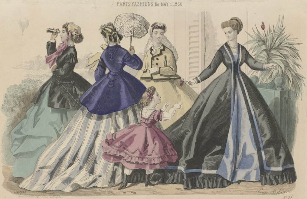 Mid-19th century women were essentially bell-shaped, their skirts first being filled out by multiple layers of petticoats stiffened by starch, cording, and/or horsehair. These heavy layers soon were supplanted by hoops made of thin, lightweight steel connected to each other by cotton tapes. By the 1860s, skirt circumferences had expanded to the point where they were widely considered a danger to the wearer and prompted many a satirical illustration in publications of the time, such as in the one from a series below about dressing a young lady in 1860. Although it may seem that women could never sit down in such contraptions, the hoops or crinoline simply folded down when sitting. Imagine being in the center of a large slinky and you can get some idea of what it might have been like.