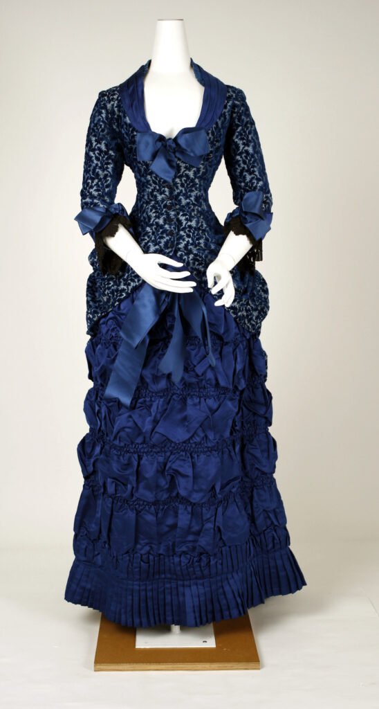 In the 1870s and 1880s, skirts’ circumference narrowed, with the bulk of fabric being brought around to the back, where the rear end was emphasized with the help of a bustle. Now, the silhouette was relatively flat in front while between the bustle and the length of her train, one could not could get any nearer to a lady from the back than a couple of feet.